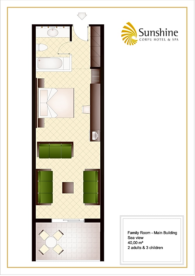 Family Room Sea View Main Building 5 Pax is 431 square feet and includes 2 single beds 80-130 width plus 3 sofa beds plus balcony, desk, satellite tv , hairdryer, and safe.
